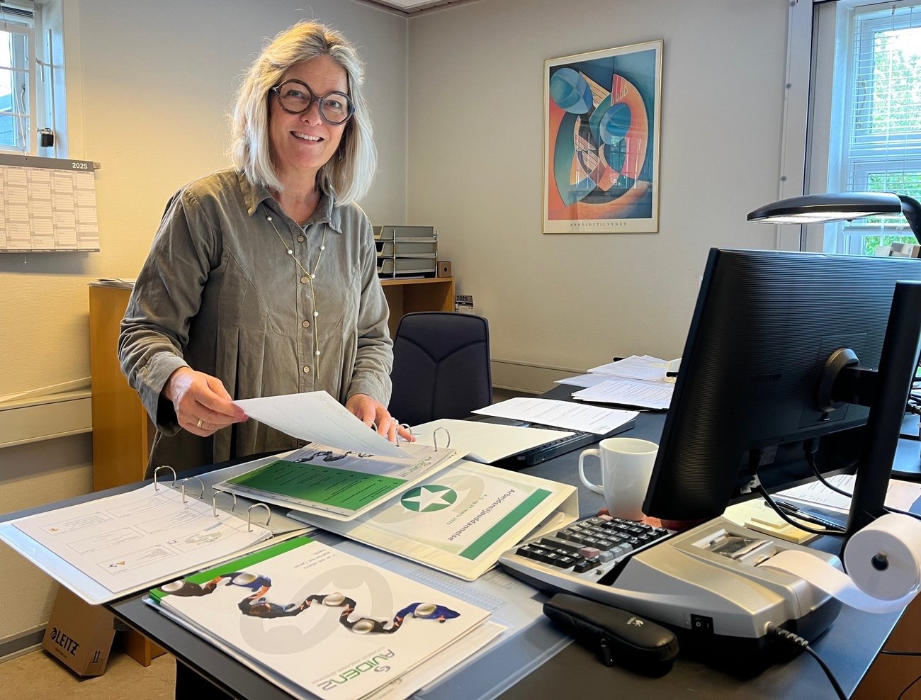 På billedet er Hanne, vores kursussekretær, i fuld gang med at klargøre mapper med materiale til deltagerne på et af vores kurser.